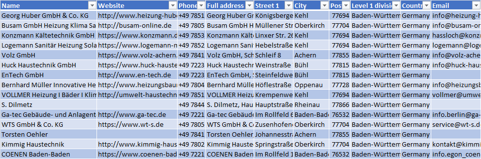 Inhalt der Heizung- und Sanitärunternehmen Adressliste