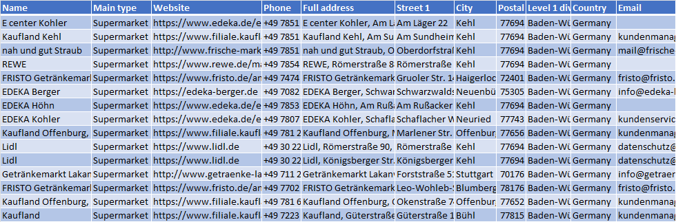 Jeder gecrawlte Supermarkt erhält einen eigenen Eintrag in der Adressliste. Die Daten sind klar strukturiert und spaltenbasiert aufgebaut, sodass Du sie direkt in Excel, CRM-Systemen oder Analyse-Tools weiterverarbeiten kannst.