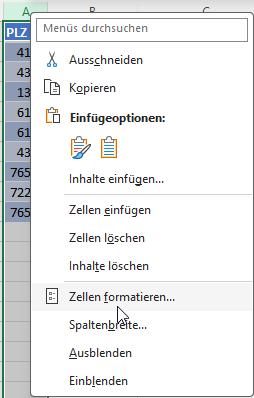 Falls du den Textimport-Assistenten nutzt: Im Schritt, in dem Spaltenformate gewählt werden können, markiere die PLZ-Spalte und setze das Datenformat auf Text.