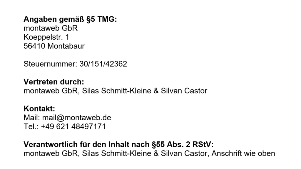 Die montaweb GbR bemüht sich im Rahmen des Zumutbaren, auf dieser Website richtige und vollständige Informationen zur Verfügung zu stellen.